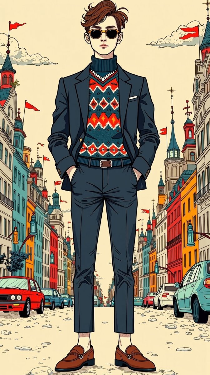 Иллюстрация в наивном стиле сочетает в себе элементы фольклорного искусства и мультяшности с использованием техник рисования тушью, doodle-арт и zentangle. В центре композиции – стильный молодой человек, воплощающий симбиоз эстетики Миуччи Прада и Тома Форда. Его образ представляет собой гармоничное сочетание строгости и игривости: лаконичный темно-синий блейзер в духе Тома Форда контрастирует с ярким узором свитера, отсылающего к дизайну Миуччи Прада. Идеально сидящие брюки и начищенные лоферы завершают безупречный ансамбль. Теплое выражение лица молодого человека излучает оптимизм и энергию, а на заднем плане разворачивается причудливый городской пейзаж, насыщенный яркими красками, создавая ощущение волшебства и беззаботности. Работа выполнена в минималистичной манере с использованием техники paper cut gouache illustration, что придает ей особую легкость и воздушность. Вся композиция наполнена обаянием и демонстрирует уникальное сочетание модных тенденций и авторского видения. Это произведение искусства – визуальная ода современному мужскому стилю, в котором классика встречается с авангардом, а строгость – с фантазией