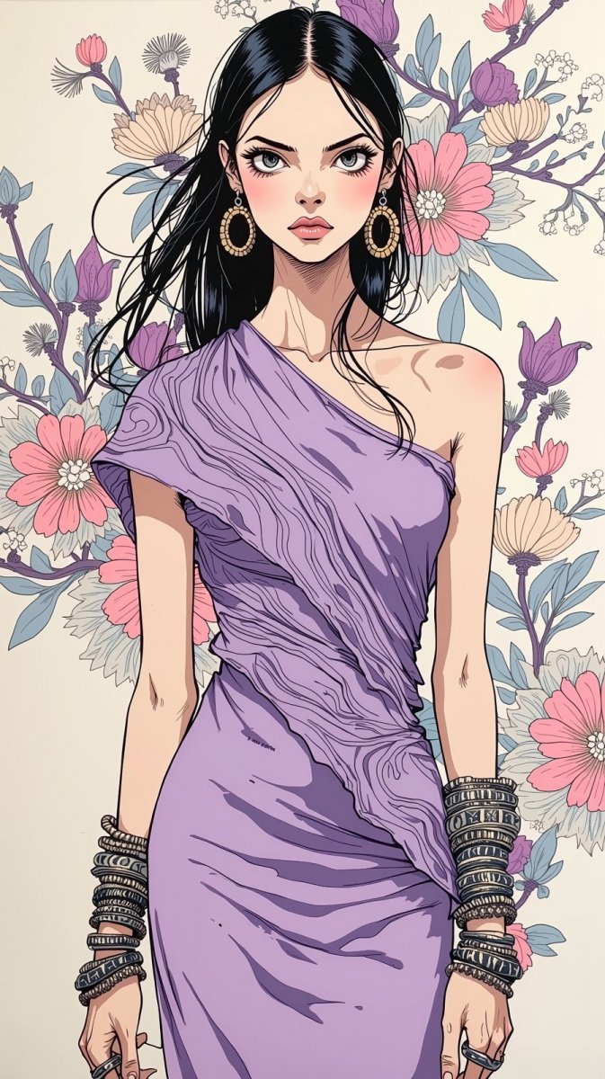 #1 Ink drawing, illustration, naive art, doodling, zentagle, folk art, cartoonish, paper cut gouache illustration, minimalism A vibrant fashion girl exudes confidence, showcasing a bold fusion of Alexander McQueen and Iris van Herpen styles. She wears a structured asymmetrical dress with sharp, distorted lines in soft lavender, mirroring McQueen's avant-garde silhouettes, while fluid, organic motifs in the sheer layer reflect van Herpen's signature mathematical designs. Accessories include layered metallic bracelets and statement earrings, with a fierce expression that radiates empowerment, set against an abstract floral background. #role_des...