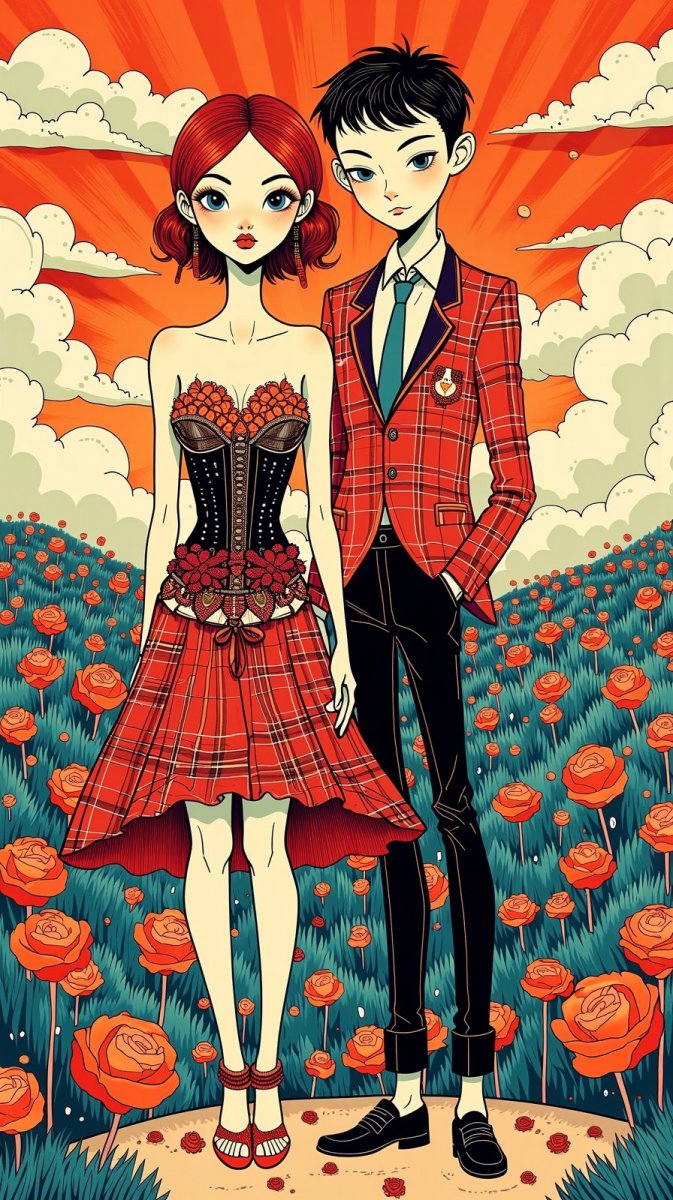 Эта яркая иллюстрация в духе наивного искусства и народных мотивов представляет собой очаровательную пару, воплощающую смешение стилей культовых дизайнеров Жана-Поля Готье и Вивьен Вествуд. Женский образ завораживает драматичным корсетом с изящной кружевной отделкой, который гармонично сочетается с развевающейся юбкой в клетку – отсылка к панк-наследию Вествуд. Мужской костюм выделяется строгим, но театральным блейзером с объемными лацканами, что является характерной чертой творчества Готье. Композиция пронизана атмосферой легкости и игривости, подчеркнутой радостными выражениями лиц героев и выдержанной цветовой гаммой. На фоне живописного неба эта пара излучает романтическое настроение и бунтарский дух, словно приглашая зрителя окунуться в мир смелых экспериментов с модой и самовыражением. Использование техник рисования тушью, иллюстрации, элементы Zentangle и напоминающие вырезки из бумаги акварельные иллюстрации создают неповторимую визуальную текстуру, добавляя изображению глубины и оригинальности. Вся работа пронизана духом минимализма, что позволяет сосредоточиться на деталях костюмов и передать эмоциональное состояние героев. Это не просто иллюстрация моды, а настоящая история любви, рассказанная языком искусства