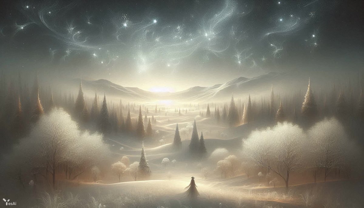 Заснеженная симфония зимней ночи, сотканная из серебристых оттенков и нежной дымки. Бескрайняя заснеженная поляна утопает в мерцающем свете звездной черной ночи, а легкие воздушные облака добавляют загадочности этому волшебному пейзажу. Ледяные деревья, покрытые снежной пылью и сложными фрактальными узорами, создают ощущение хрупкой красоты и зимнего великолепия. В центре композиции – изящная леди в воздушном платье и элегантной шляпке, ее фигура кажется сотканной из света и тени, добавляя сцене нотку мечтательности и нежности. Использование белого, кремового, бежевого и желтого цветов создает ощущение чистоты и спокойствия, а акценты голубого и синего придают глубину и объем изображению. Тонкие переходы от светло-серебристых тонов к терракотовым создают гармоничную палитру, подчеркивающую эстетическую привлекательность картины. Высокая детализация, проработка мельчайших элементов и выгодный ракурс позволяют полностью погрузиться в эту сказочную атмосферу зимней ночи. Изображение выполнено в технике цифровой живописи с высоким разрешением 4k, что обеспечивает максимальную четкость и реалистичность каждой детали, передавая всю красоту и великолепие этого нежного и элегантного пейзажа