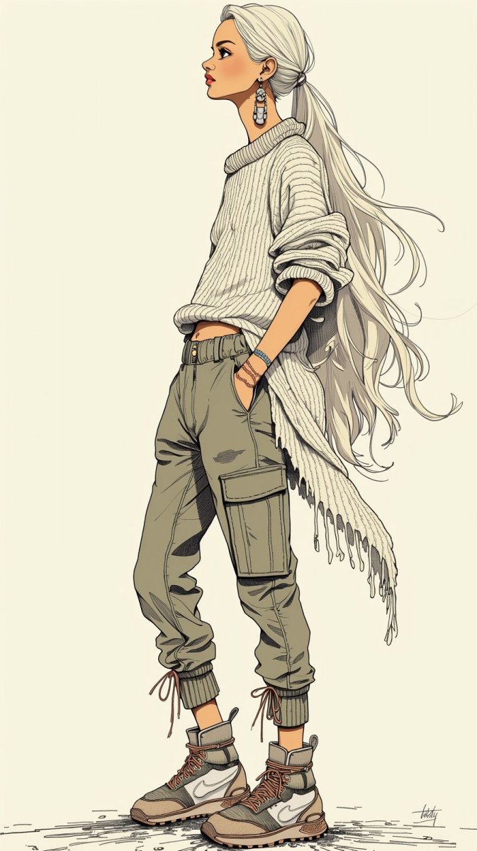 #2 Ink drawing, illustration, folk art, doodling, zentagle, paper cut gouache illustration, minimalism features a fashionable girl with long white hair, embodying a mix of Alexander Wang's edgy aesthetics and the romantic style of Issey Miyake. She sports a pair of sleek cargo pants with innovative fabric draping while wearing an oversized knit top that flows beautifully. Her delicate silver earrings and layered rings highlight her individuality, exuding a vibe of effortless chic, infused with a sense of empowerment in an urban setting. #role_design