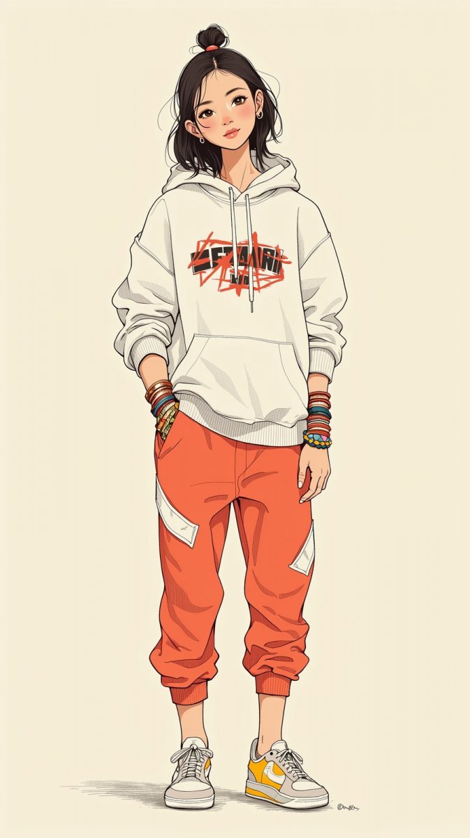 #2 Ink drawing, illustration, naive art, doodling, folk art, cartoonish, paper cut gouache illustration, minimalism depicts a casual fashion girl with a touch of urban flair. She wears a comfortable oversized hoodie featuring a unique graphic design, inspired by the streetwear influences of Off-White, paired with stylish jogger pants that boast a sleek, sporty aesthetic reminiscent of Stella McCartney's designs. Casual slip-on shoes complement her outfit, while colorful bracelets add a playful twist. Her relaxed expression embodies the freedom and creativity of modern casual wear. #role_design