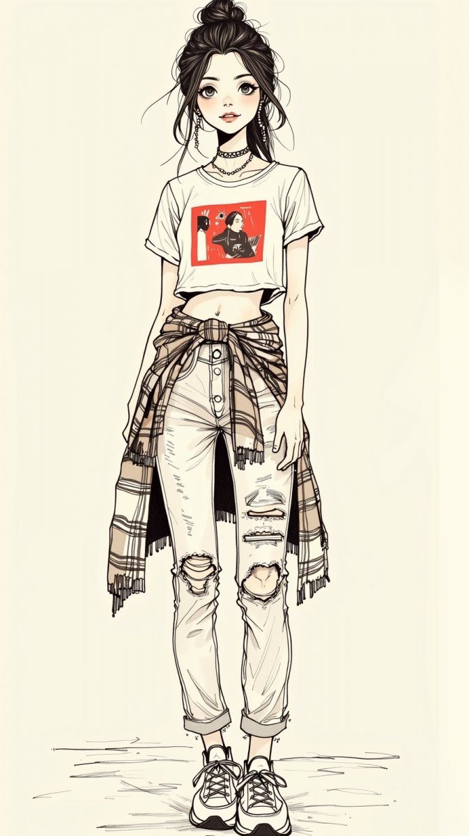 #3 Ink drawing, illustration, naive art, bold black outlines, translucent gouache filling captures a trendy casual fashion girl embodying a cool, laid-back vibe. She wears a cropped graphic t-shirt featuring abstract art inspired by the bright innovation of Alexander Wang, paired with high-waisted distressed jeans channeling the rebellious spirit of Vivienne Westwood. An oversized plaid shirt tied around her waist adds a touch of texture, while chunky sneakers and layered earrings enhance her youthful energy. Her confident stance and bright smile convey a strong sense of individuality. #role_design