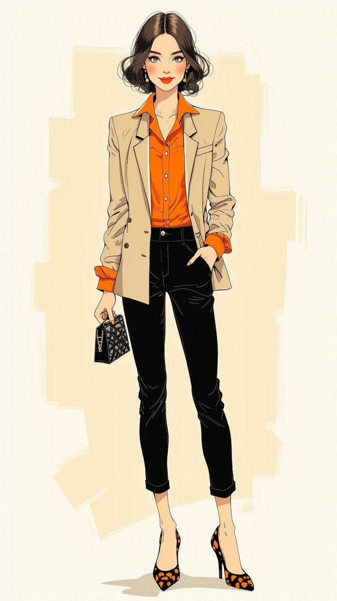 #4 Ink drawing, illustration, naive art, doodling, zentagle, folk art, cartoonish, paper cut gouache illustration, minimalism A confident fashion model with long legs embodies the styles of Miuccia Prada and Coco Chanel through her attire. She wears a chic, tailored beige blazer paired with a vibrant orange silk shirt that captures Prada's playful spirit, alongside classic black cigarette pants that echo Chanel's timeless sophistication. Bright lipstick draws focus to her warm smile, while her impeccable French manicure ties her look together, exuding an air of elegance and understated charm against a minimalist backdrop. #role_design