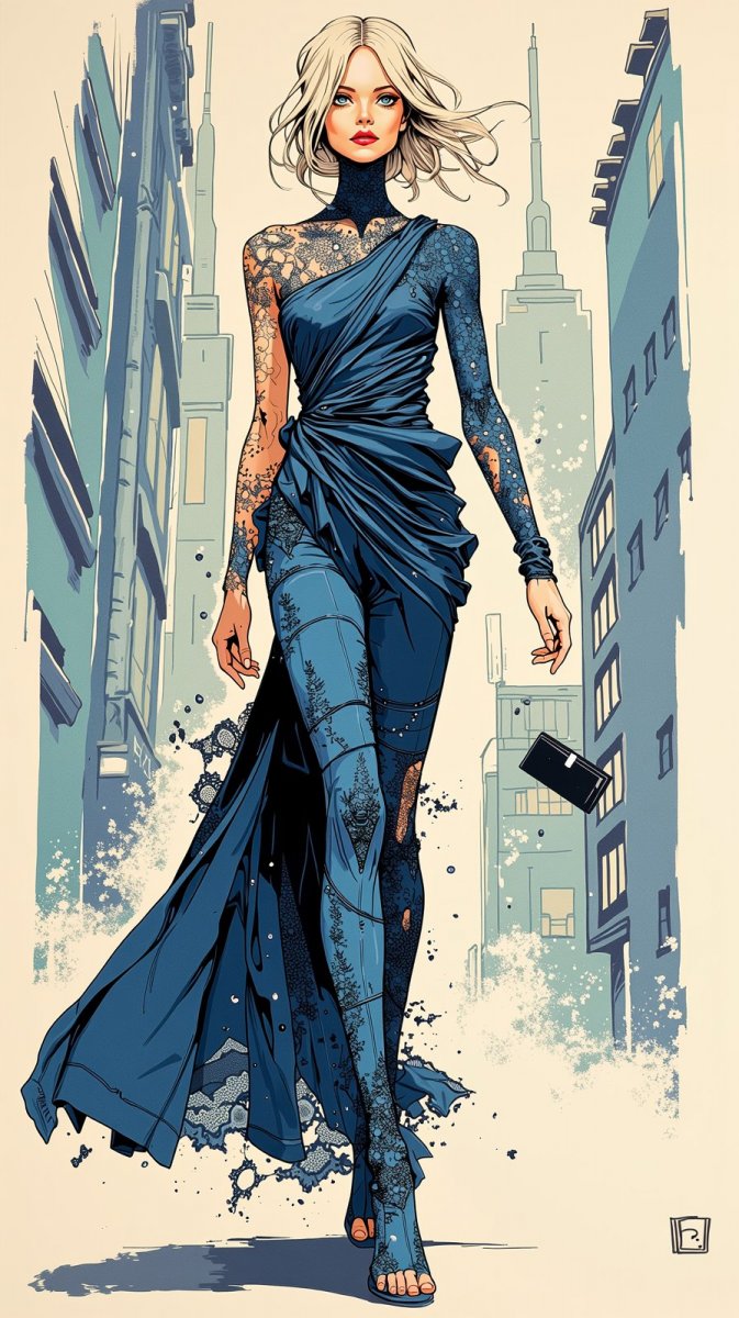 #5 Ink drawing, illustration, naive art, doodling, zentagle, folk art, cartoonish, paper cut gouache illustration, minimalism A bold fashion model with long legs radiates charisma, merging the fierce aesthetics of Rick Owens with the alluring designs of Iris van Herpen. She struts in a unique, structured draped gown in deep indigo that echoes Owens' sculptural shapes, layered with intricate lace elements channeling van Herpen's ethereal quality. Her bright lipstick is beautifully contrasted with a delicate, fluid hairstyle, and a meticulous French manicure enhances her confident poise, set against a dreamy and abstract urban landscape. #role_...