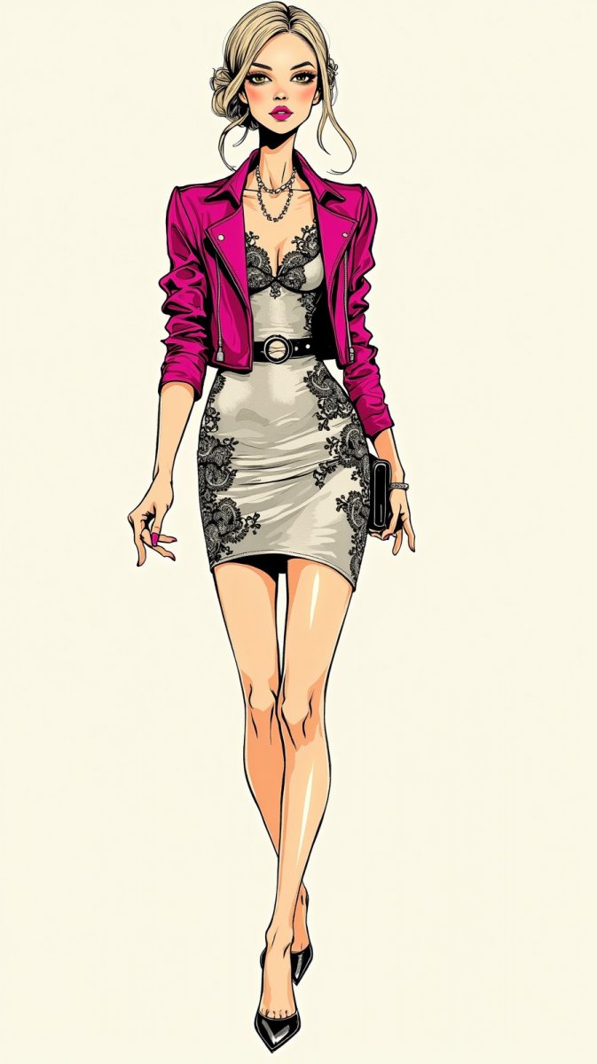 #2 Ink drawing, illustration, naive art, doodling, zentagle, folk art, cartoonish, paper cut gouache illustration, minimalism A fashionable girl with long legs poses elegantly, showcasing a harmonious blend of Donatella Versace and Alexander McQueen’s styles. She dons a fitted, metallic silver bodycon dress adorned with intricate lace features that channel McQueen's dramatic flair, complemented by a vibrant fuchsia leather jacket showcasing Versace's boldness. Stiletto heels elevate her stance while her bright lipstick and flawless French manicure radiate glamour, creating a spirited atmosphere of haute couture allure. #role_design