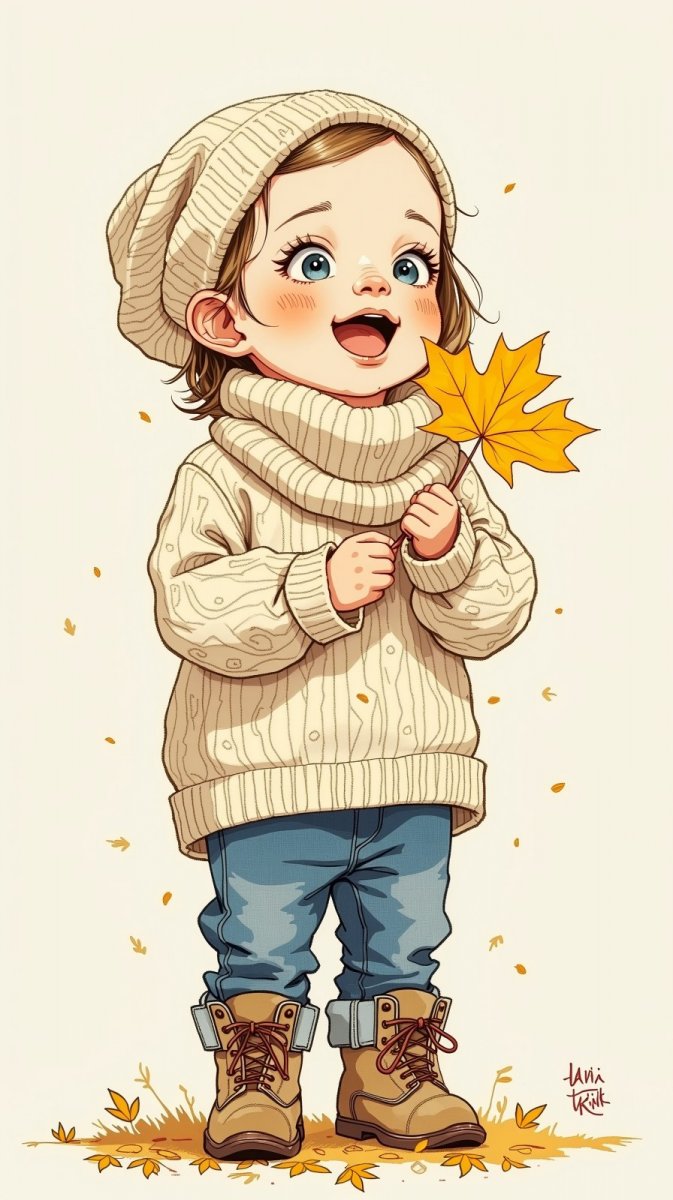 #5 Ink drawing, illustration, cartoonish, gouache illustration, minimalism, presenting a stylish child in a cozy oversized knitted sweater channeling the playful spirit of Moschino, while sporting classic blue jeans influenced by the timeless designs of Tommy Hilfiger. With a bright golden maple leaf clutched tightly in their hands, the child's excited expression radiates pure delight, encapsulating the joy of seasonal transitions and youthful exuberance. #role_design