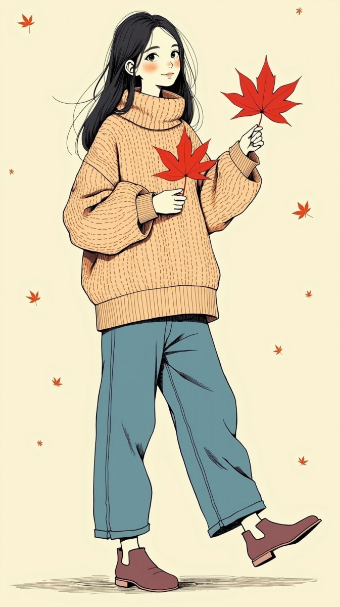 #1 Ink drawing, illustration, cartoonish, doodling, gouache illustration, minimalism, featuring a cozy fashion girl in an oversized knitted sweater reminiscent of the charming textures seen in Issey Miyake's designs. She pairs it with loose-fitting blue jeans inspired by the relaxed silhouettes of Raf Simons, creating a seamless blend of comfort and style. In her hands, she holds a vibrant red maple leaf, contrasting beautifully with her soft colors, her warm expression embodying a sense of autumn joy and introspection. #role_design
