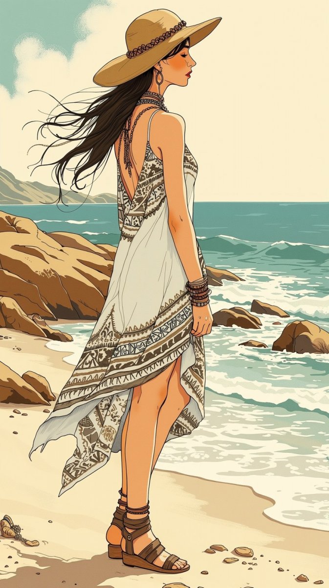#5 Ink drawing, illustration, naive art, cartoonish, paper cut gouache illustration brings to life a dreamy boho girl at the beach embodying the essence of Zadig Voltaire and Ulla Johnson. She sports a lightweight, asymmetrical dress adorned with tribal patterns, combining Johnson's global inspiration with the casual elegance of Zadig Voltaire. With layered necklaces and worn leather sandals, her gazing at the horizon showcases an adventure-seeking spirit, capturing the effortless merge of style and nature’s splendor. #role_design