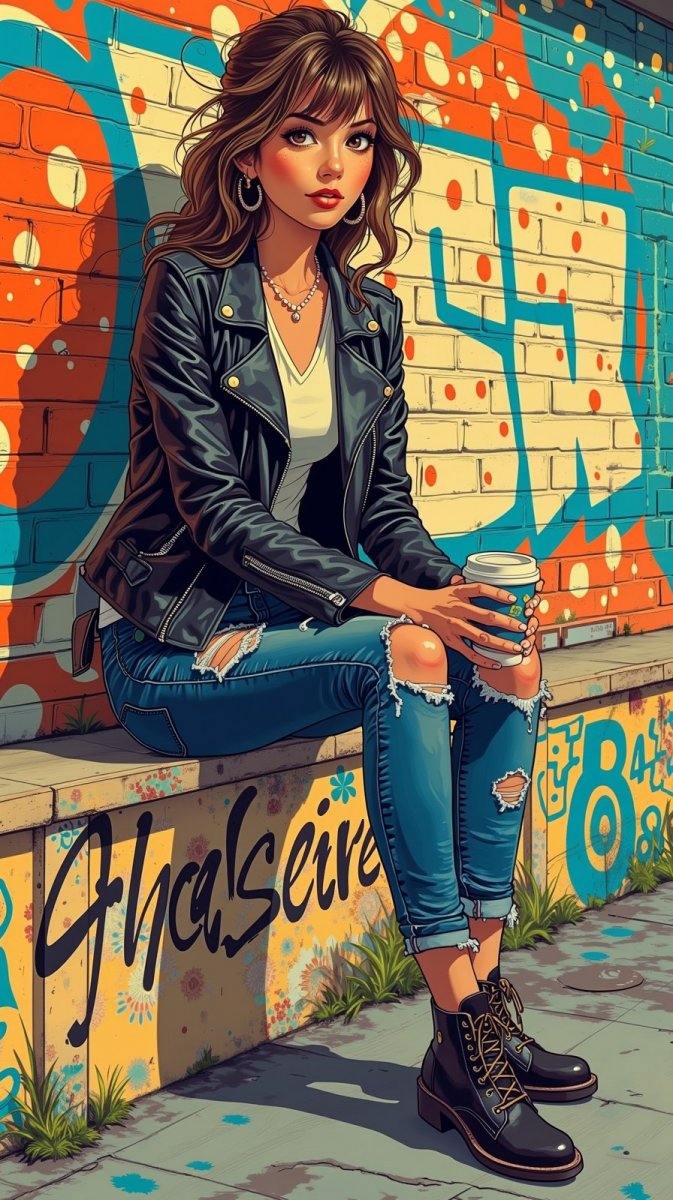 1. a stylish woman wearing a black leather jacket and ripped jeans, sitting on a graffiti-covered wall, holding a coffee cup, with her hair casually styled and a confident expression, urban fashion photography in a vibrant setting.
