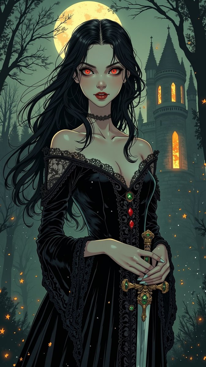 Загадочный портрет прекрасной вампирши, чьи длинные черные волосы ниспадают подобно шелку, окутывает ее образ в атмосфере тайны и ночи. Она предстает на фоне мрачного леса, где лунный свет пробивается сквозь ветви деревьев, создавая причудливые тени на ее бледной коже. Яркие, алые глаза полны неразгаданных тайн и манящей соблазнительности, словно приглашают в мир вечной ночи. Изысканное черное бархатное платье с кружевными деталями, словно сошедшее со страниц давно забытой эпохи, подчеркивает ее аристократическую красоту. На фоне древнего замка, чьи окна излучают теплое сияние огня, в воздухе витают чувства страха и восхищения, предвещая нечто неизбежное. В руках вампирши – старинный кинжал, украшенный изумрудной инкрустацией, с которым она играет как с простой картой, демонстрируя беззаботную улыбку. Этот жест придает образу особую загадочность и намекает на ее могущество. Она источает одновременно обаяние и опасность, пленяя своей необыкновенной красотой и оставляя неизгладимое впечатление в памяти смотрящего. Ее взгляд проникает в самую душу, обещая вечные тайны и запретные наслаждения. Это воплощение ночного кошмара и мечты о вечной молодости, символ силы и соблазна в одном лице