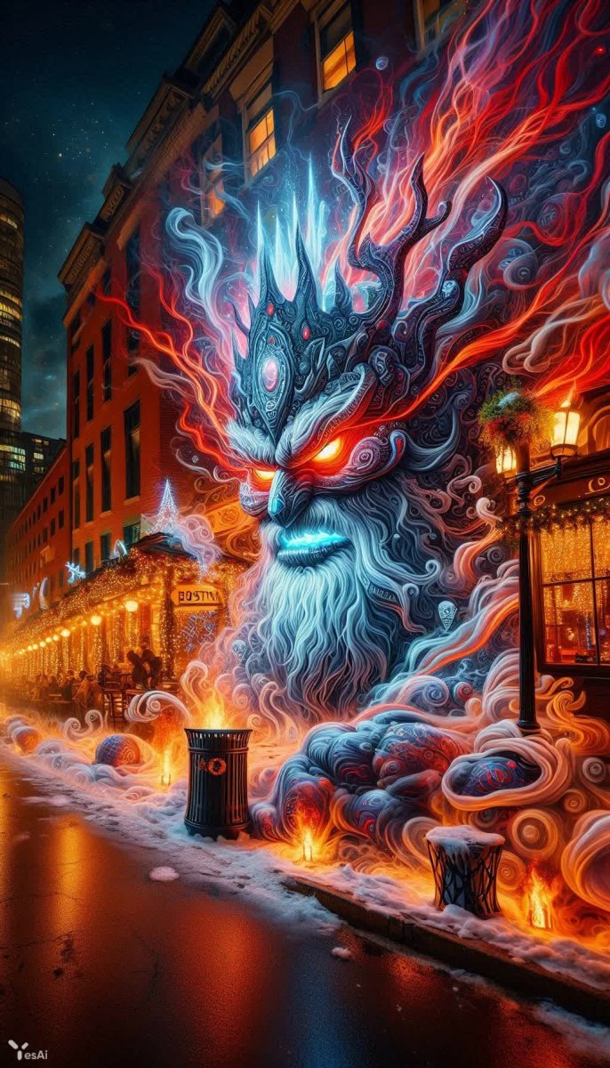 Firelit, Cozy, Halloween, The ice Titan, Red eyes, Smoky ribbons, Boston street, Bar, Helm, Pictures, Vortex, Rays through, Cinema, Film clip, Glowing, Pointillism, Painted, Dots, The absurdity, Cartoon, Absolutely, The image was created with colored pencils.