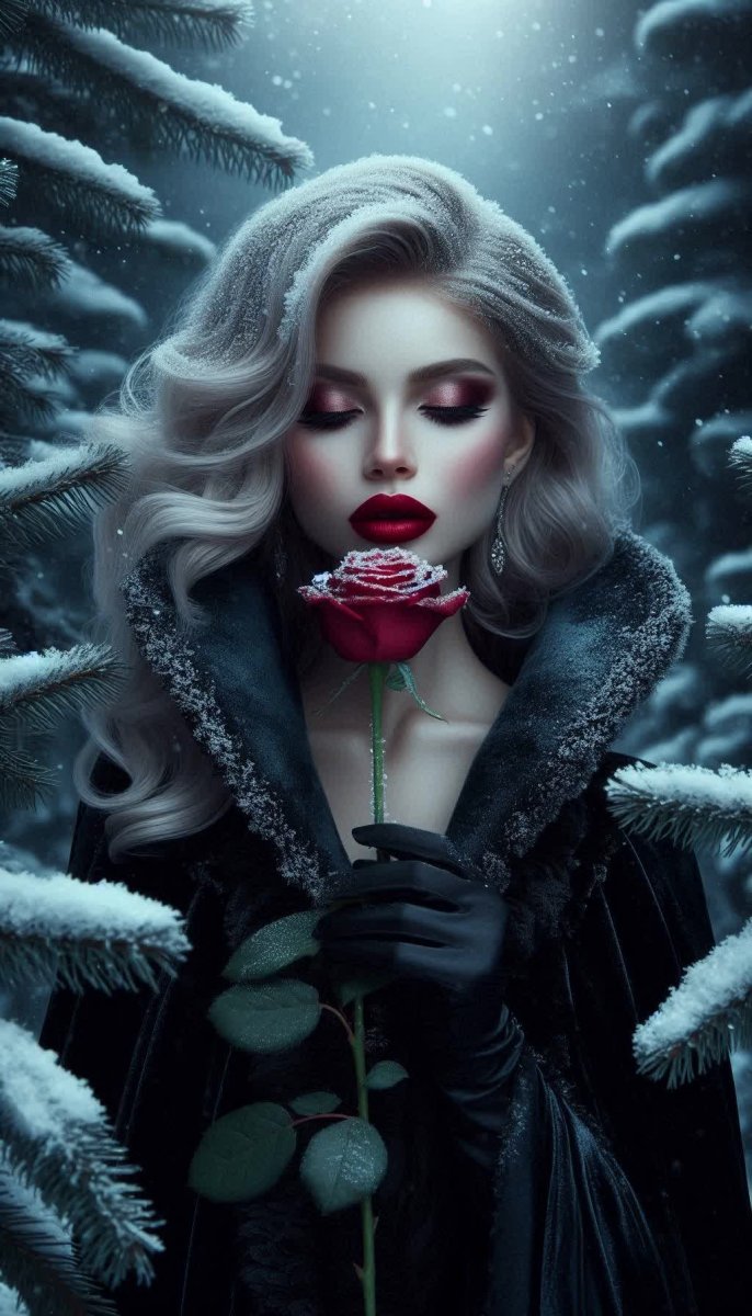 5. Портрет вампирши с окружающими еловыми деревьями, покрытыми инеем. Она одета в темное бархатное пальто и целует кровавую розу, её губы окрашены в глубокий красный цвет. Свет от полночи освещает её тонкие черты лица, придавая ей ауру загадочности и интригующей красоты. Вокруг неё летят снежные кометы, создавая ощущение зимней волшебной ночи.
