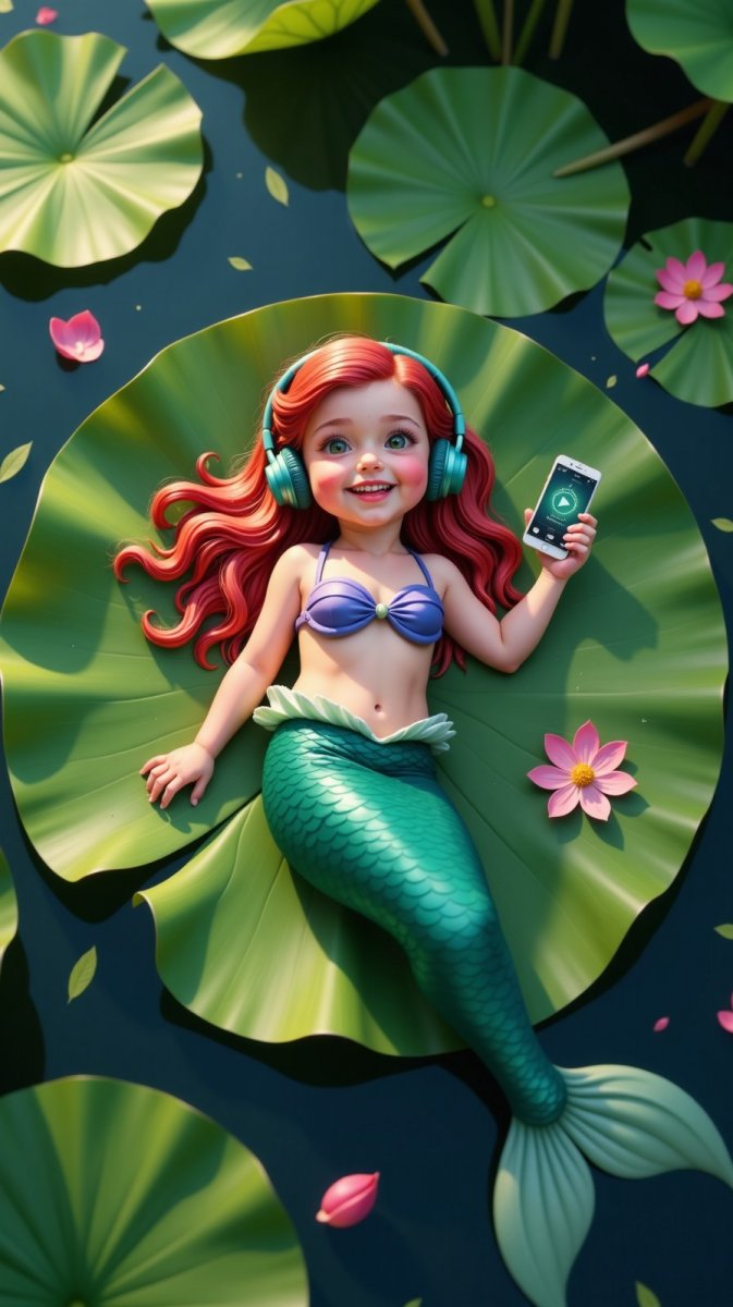 little mermaid child, with headphones and a phone in her hands, lying on a green lotus leaf on the water, photo realism, digital art, trending on cgsociety, pop surrealism, happy listening to music, portrait of a mermaid, cute girl, animated movie, music, desktop wallpaper, Jean-Sebastian Rossbach, relaxing in a pond