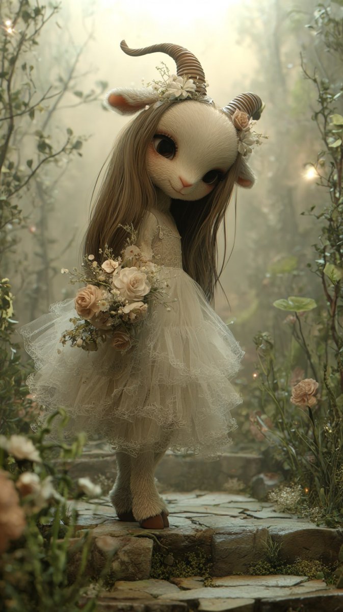 Волшебное путешествие юной козочки по заколдованному саду – завораживающая картина, сотканная из мечтаний и фантазий. Нежная девушка с длинными волосами и огромными выразительными глазами, обрамленными густыми ресницами, словно сошла со страниц сказочной книги. Её воздушное платье из тюля с открытыми плечами подчеркивает хрупкость и невинность образа, а пушистые ножки с копытками добавляют ей очарования и загадочности. На фоне таинственного тумана, окутавшего сад другого мира, она грациозно прогуливается по каменным дорожкам, украшенным разнообразием растений и цветов. В её руках – букет полевых цветов, словно символ нежности и чистоты. На голове возвышаются изящные рожки, придающие ей поистине сказочный вид. Эта необыкновенная фотография – настоящая ода природе и магии, воплощенная в образе милой козочки. Она переносит зрителя в мир грез и фантазий, где возможно всё, а каждый уголок сада хранит свои секреты. Картина излучает атмосферу таинственности и волшебства, заставляя поверить в существование сказочных существ и чудесных миров. Невероятное сочетание красоты и нежности, загадочности и очарования – вот что делает этот образ таким притягательным и незабываемым