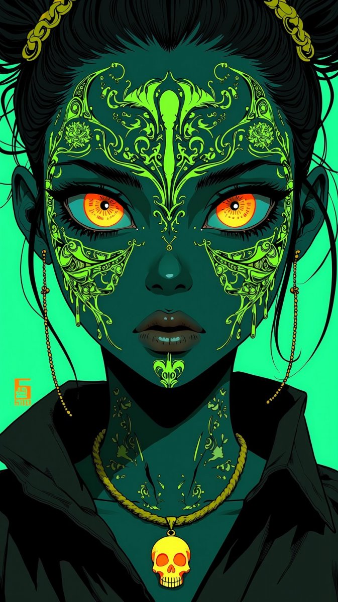 Яркий портрет, где красота и смелость сливаются в единое целое. Лицо модели украшают замысловатые неоново-зеленые узоры, напоминающие крылья бабочки – сложный и притягательный рисунок, который сразу же привлекает внимание. Контраст между яркими цветами и темным тоном кожи создает невероятно эффектный визуальный образ, полный энергии и живости. Акцент на деталях подчеркивается массивной подвеской в виде черепа – неожиданный и провокационный элемент, добавляющий портрету дерзости и индивидуальности. Это не просто изображение, а манифест уверенности и самовыражения, где каждый штрих несет в себе глубокий смысл. Композиция полна динамики и визуальной насыщенности, демонстрируя смелое сочетание эстетики и бунтарства. Этот образ воплощает собой современную красоту, которая ломает стереотипы и утверждает право на уникальность. Он передает ощущение силы, свободы и готовности к новым свершениям, вдохновляя на самовыражение и творчество. Использование неоновых оттенков создает впечатление свежести и новизны, а темный тон кожи служит идеальным фоном для ярких акцентов, подчеркивая глубину и загадочность образа. Это визуальный гимн индивидуальности и смелости, который не оставляет равнодушным