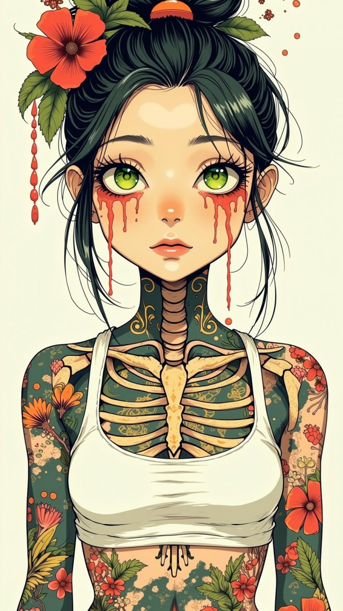 Загадочная красотка с замысловатой татуировкой предстает в белом топе на тонких бретельках, а ее тело украшено детальными рисунками в стиле скелет-арт. Яркий акцент создает неоново-зеленый макияж глаз и неожиданные брызги того же оттенка, словно намек на тропическую локацию. Образ излучает уверенность и дерзость, сочетая нежность белого топа с мрачностью тематики смерти и яркими акцентами экзотики. Это визуальная история о контрастах: жизнь и смерть, свет и тьма, природа и искусственность. Детализация татуировок говорит о глубоком личном смысле или принадлежности к определенной субкультуре. Взгляд девушки, подчеркнутый неоновым макияжем, словно приглашает зрителя в мир ее внутренних переживаний и скрытых желаний. Она – воплощение современной богемности, где традиции переплетаются с авангардными тенденциями, создавая уникальный и запоминающийся образ. Эта фотография - не просто портрет, это заявление о себе, манифест индивидуальности, отраженный в каждой детали