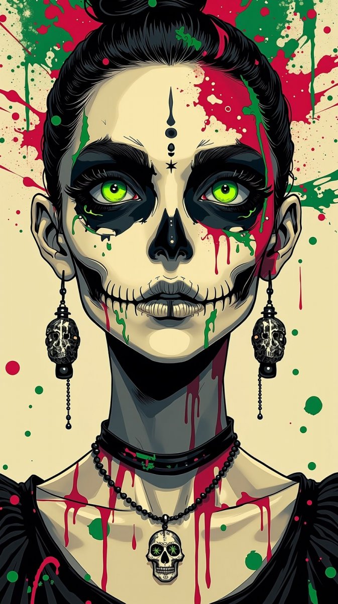 #2. a ghost with surreal makeup and a dark complexion displays dramatic accessories; her skull makeup features bright green accents cascading down her face while wearing black earrings and a skull pendant necklace amidst colorful splashes. #role_dripping