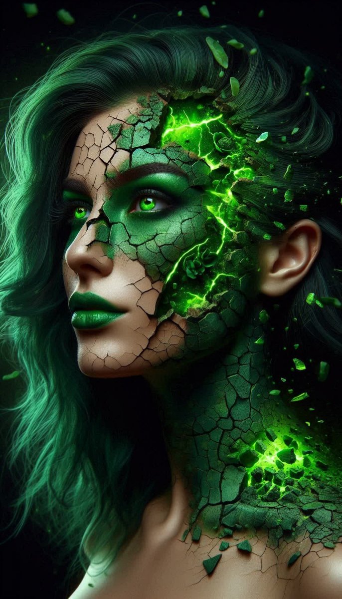 Зеленый разлом: фантазийный портрет прекрасной ведьмы с трещинами на коже - Результат работы нейросети Dalle-3