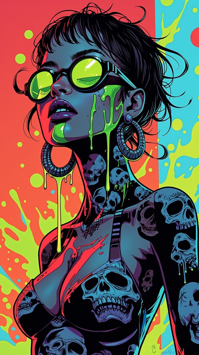#1. a girl with liquid green makeup cascading down her dark skin wears bold earrings and a skull-themed outfit, set against a vivid backdrop of neon colors #role_dripping