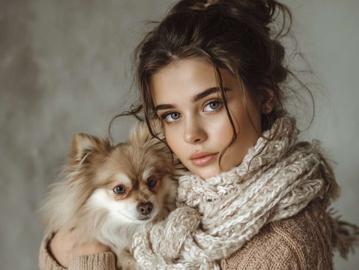 Изящный портрет современной женщины, излучающей утонченность и внутреннюю гармонию. В центре внимания – молодая девушка с короткой стрижкой, чья внешняя непринужденность контрастирует с меланхоличным настроением, запечатленным в ее взгляде. Образ выстроен вокруг комфорта и стиля: мягкий кашемировый свитер с элегантным камельевым бантом подчеркивает нежность черт лица, а широкие светлые брюки добавляют образу легкости и воздушности. Уютный шарф завершает ансамбль, создавая ощущение тепла и защищенности. Рядом с девушкой – пушистый пес, верный друг и символ преданности, усиливающий атмосферу спокойствия и умиротворения. Естественный макияж в теплых тонах подчеркивает красоту кожи и выразительность глаз, не перегружая образ. Особый художественный прием – двойная экспозиция – придает фотографии загадочность и глубину, словно соединяя реальность и мечту. Это не просто фотография, а поэтичный рассказ о моменте созерцания, о красоте простых вещей, о хрупкости женской души и о вечной связи между человеком и его питомцем. Картина вызывает чувство легкой грусти, но в то же время дарит ощущение покоя и гармонии с собой и окружающим миром. Это гимн естественной красоте и утонченному стилю, воплощенный в едином визуальном образе