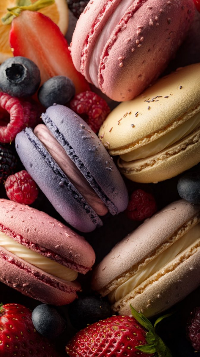 vibrant macarons with fresh fruits swirling around, featuring strawberries and blueberries, colorful and photorealistic, soft light, dark BG --ar 9:16