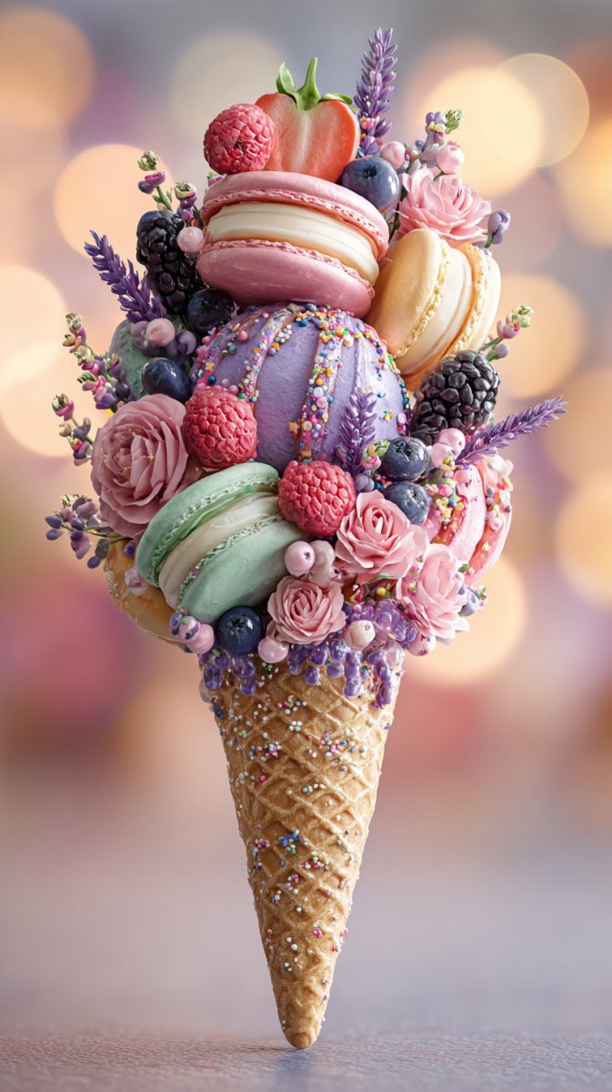 colorful ice cream cone with macarons and fresh berries, surrounded by splashes of color, HD, high contrast, playful elements, soft pastel BG --ar 9:16