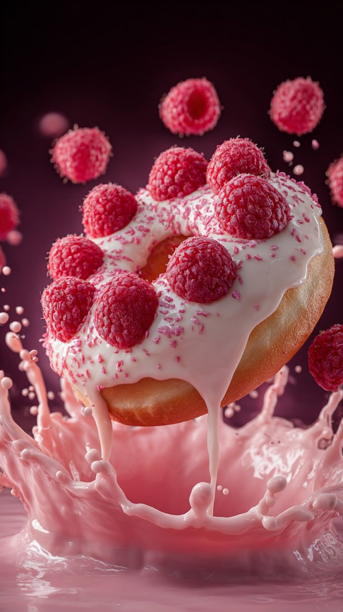 a pink donut with white glaze and fresh raspberries splashing in pink milk, HDR, vibrant colors, photorealistic, dynamic composition, black BG --ar 9:16