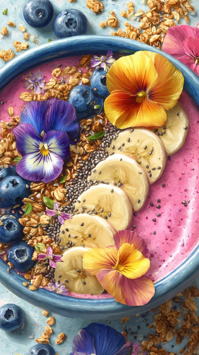 watercolor illustration of a vibrant smoothie bowl, topped with sliced bananas, chia seeds, and edible flowers, bowl is deep blue ceramic, scattered blueberries and granola around, colorful and energizing presentation --ar 9:16