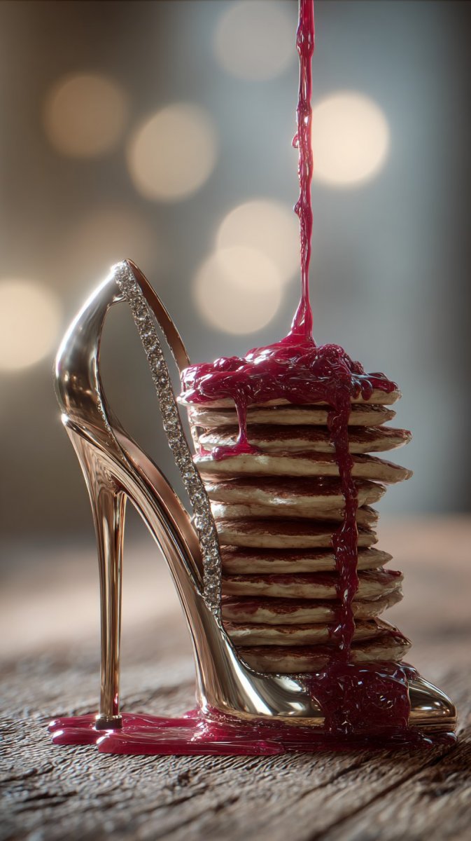 tall high-heeled shoe with stack of pancakes, golden brown pancakes with thick raspberry sauce dripping down, placed on wooden surface, bg blurred with kitchen elements --ar 9:16