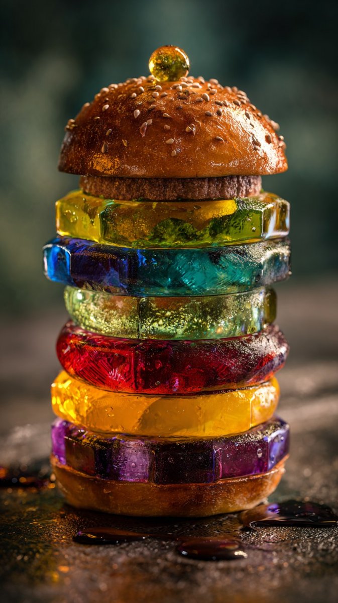 colorful burger layered with glass, each layer a different vibrant color, sesame seed bun, bg is dark grey, creating a lively and playful aesthetic --ar 9:16