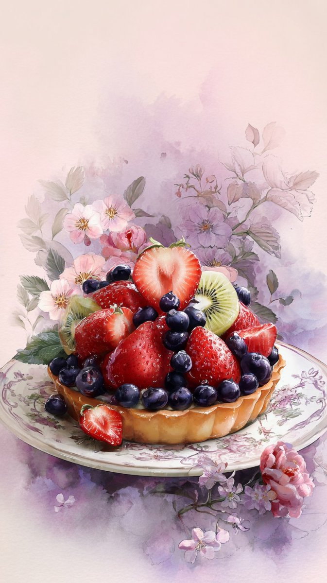 ink drawing, watercolor illustration of a fruit tart on a delicate plate, colorful assortment of fresh strawberries, kiwi, and blueberries arranged on a creamy custard filling, crust is golden and crumbly, soft pastel background with whimsical patterns --ar 9:16