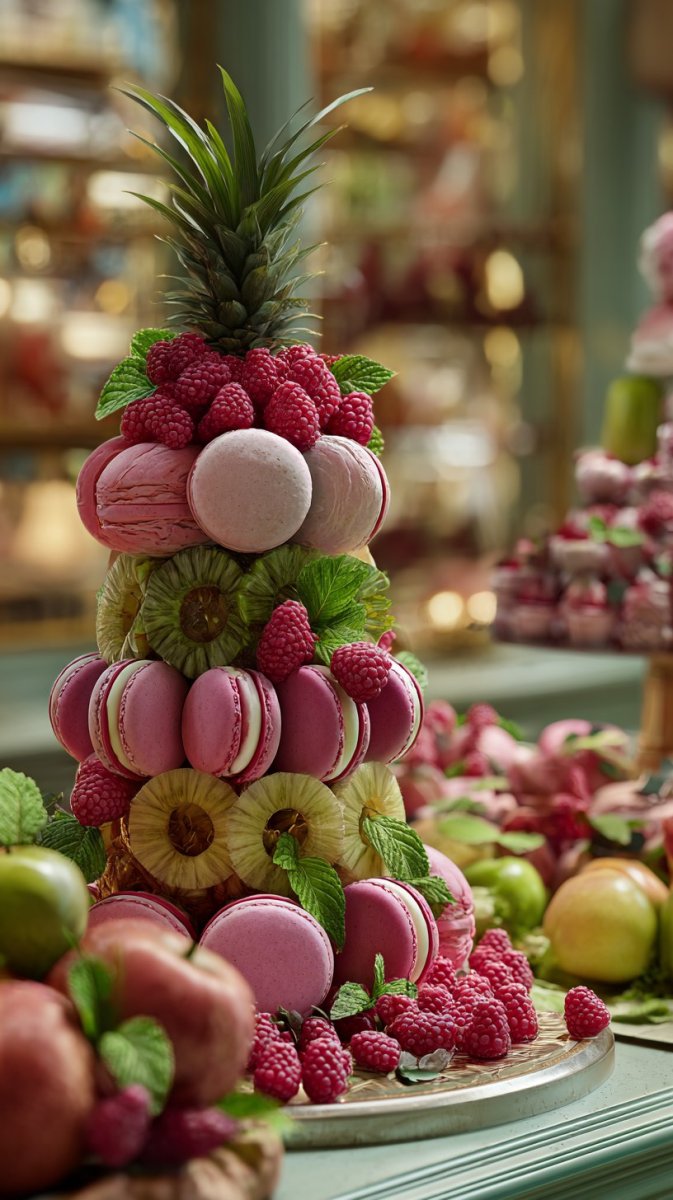 pink macarons with fresh raspberries and pineapple circles, surrounded by mint leaves, colorful aesthetic appeal, artistic vibe, soft focus --ar 9:16