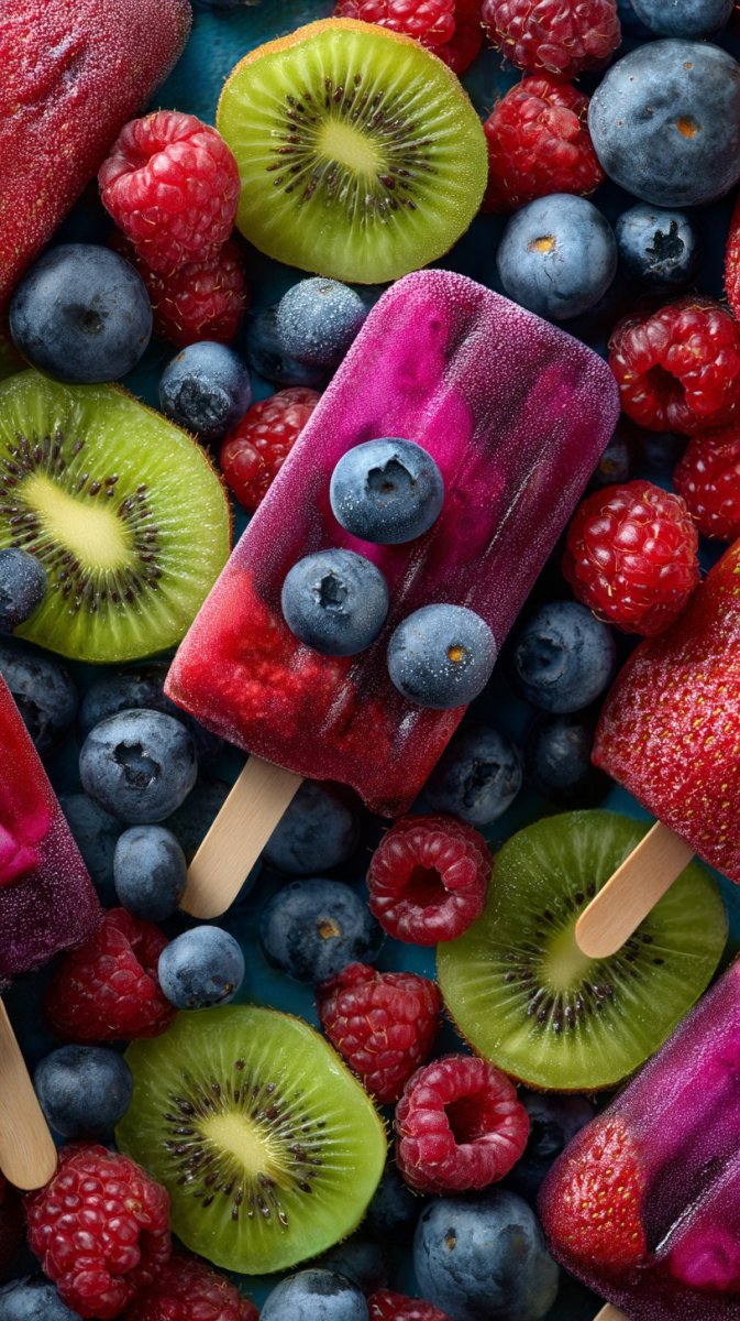 berries, including raspberries and blueberries, beautifully arranged alongside colorful popsicles on sticks and vibrant kiwi slices, top view, cheerful composition, playful atmosphere --ar 9:16 --style raw