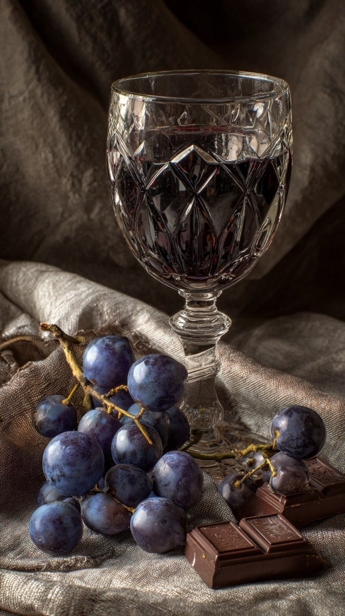 Изысканная композиция, воплощающая атмосферу утонченного наслаждения. На изображении запечатлен хрустальный бокал с насыщенным вином, элегантно расположенный рядом с аппетитной горкой темного шоколада и сочными гроздьями спелых фиолетовых винограда. Детализированные узоры акцентируют внимание на каждом элементе, создавая ощущение роскоши и изысканности. Игра света и тени подчеркивает глубину цвета вина и бархатистость шоколада, а текстура винограда добавляет реалистичности и аппетитности изображению. Картина излучает спокойствие и гармонию, приглашая зрителя насладиться моментом безмятежности и вкусовых удовольствий. Это визуальное воплощение момента блаженства – идеальный выбор для тех, кто ценит красоту в деталях и любит роскошные вещи. Изображение выполнено в вертикальном формате 9:16, что делает его подходящим для использования на мобильных устройствах или в социальных сетях, сохраняя при этом все детали и изящество композиции. Стиль raw позволяет передать максимальную реалистичность и естественность изображения, подчеркивая его художественную ценность и привлекательность. Это не просто картина – это приглашение в мир вкуса, красоты и утонченного наслаждения