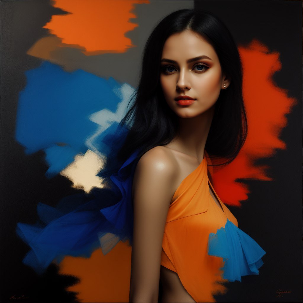 Orange, blue, beige, gray on dark, chiaroscuro, top art, canvas, oil, fabulous, delicate, seduction, fatal, beautiful, modern, sfumato