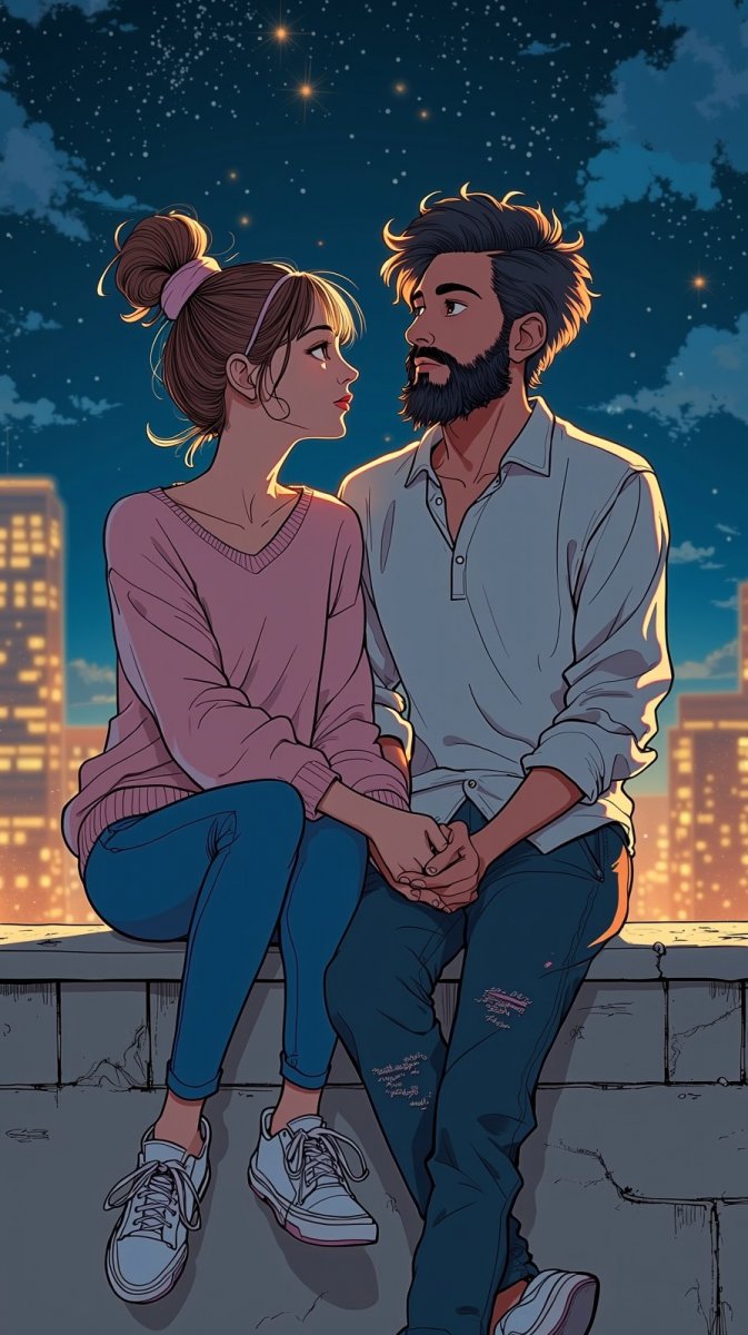 #3 couple sitting on rooftop ledge, girl with messy bun wearing oversized sweater, boy with beard in casual attire, both looking at the starry sky, hands intertwined, bg is night cityscape, illustration, ink drawing, #role_love_is