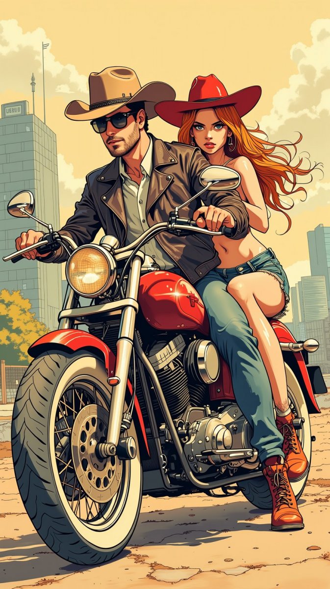 Стильная парочка на мотоцикле создает яркий образ в духе вестерн-шика. Мужчина в ковбойской шляпе и кожаной куртке уверенно позирует рядом с девушкой в джинсовых шортах и красной шляпе того же стиля. Их взгляды полны дерзости и гламура, словно они готовы к захватывающему приключению в каменных джунглях города. Иллюстрация выполнена в технике чернильного рисунка, что добавляет изображению особую выразительность и глубину. Контраст между брутальностью мужского образа и кокетливостью женского создает динамичную композицию, а городской пейзаж на заднем плане подчеркивает современность происходящего. Эта работа – идеальное сочетание классического вестерна и современной уличной моды, воплощенное в изящных линиях чернильного рисунка. Вся сцена пропитана атмосферой свободы, уверенности и неповторимого стиля. Это не просто мотоцикл и люди, это история, рассказанная через детали одежды и выражения лиц. Иллюстрация привлекает внимание своей смелостью и оригинальностью, демонстрируя мастерство художника в создании запоминающихся образов