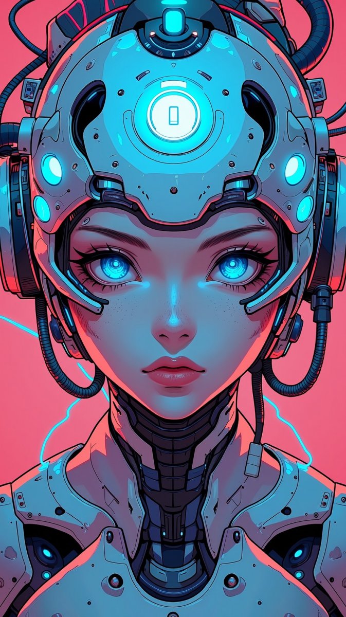 Завораживающий портрет кибернетической нимфы, сотканный из металла и света. Вблизи запечатлена безупречная красота женщины, чья кожа отливает хромом, а глаза сияют пронзительным голубым цветом. Её голову венчает футуристический головной убор, украшенный неоновыми огнями, создающими игру мерцающих бликов и придающих образу загадочность и силуэтность. Вдохновлённый эстетикой научно-фантастических фильмов 80-х годов, этот образ сочетает в себе элементы технологичного будущего и ностальгической приверженности культовым образам прошлого. Динамичный фон подчеркивает энергию и мощь кибернетической воительницы, создавая эффект погружения в мир высоких технологий и захватывающих приключений. Фотография выполнена с профессиональной точностью, демонстрируя фотореалистичность деталей и мастерство художника, сумевшего передать всю сложность и красоту этого футуристического персонажа. Это не просто изображение — это окно в альтернативную реальность, где границы между человеком и машиной размыты, а будущее кажется одновременно пугающим и завораживающим. Вся композиция пронизана духом инноваций и стремлением к совершенству, что делает её настоящим произведением искусства в жанре научной фантастики