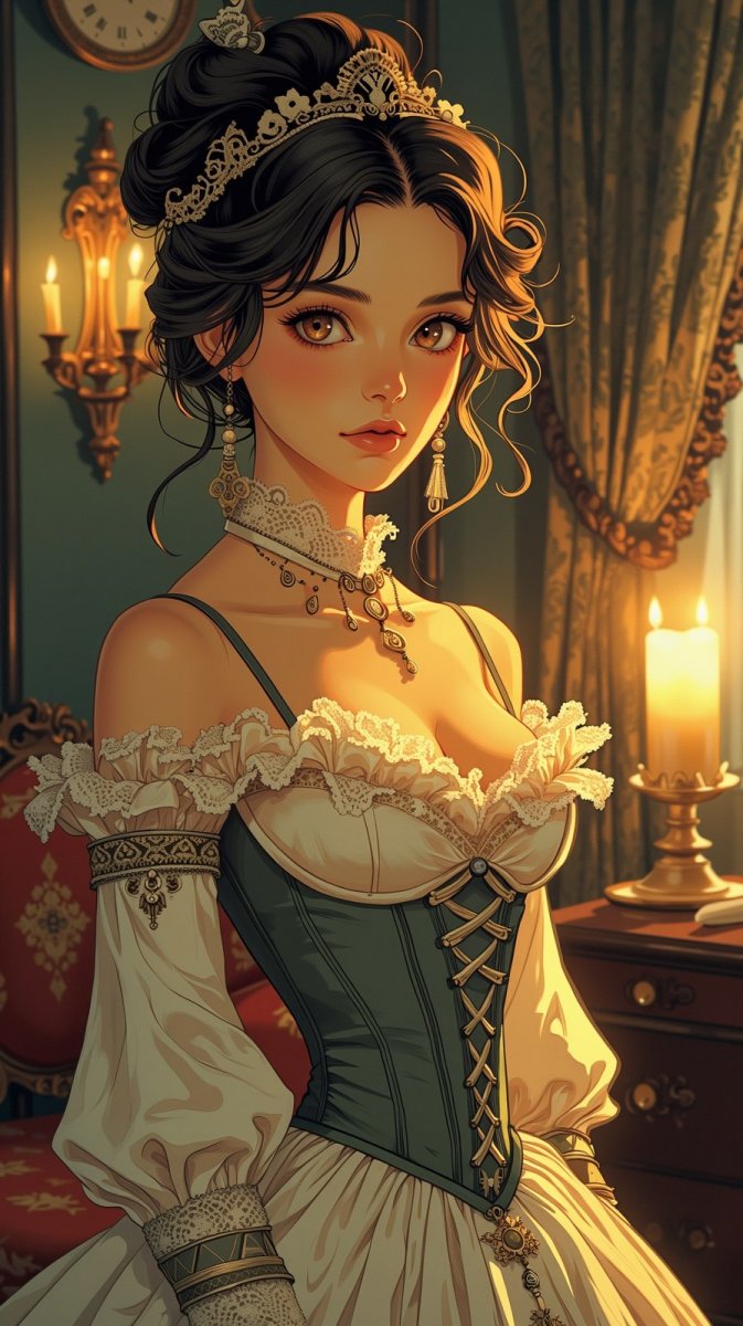 #3. professional photo, photorealistic image of a Victorian girl, elegantly posed in a lavish parlor wearing a corseted dress with intricate lace details, soft candlelight illuminating her delicate features, creating a warm, nostalgic ambiance, #sp_greek