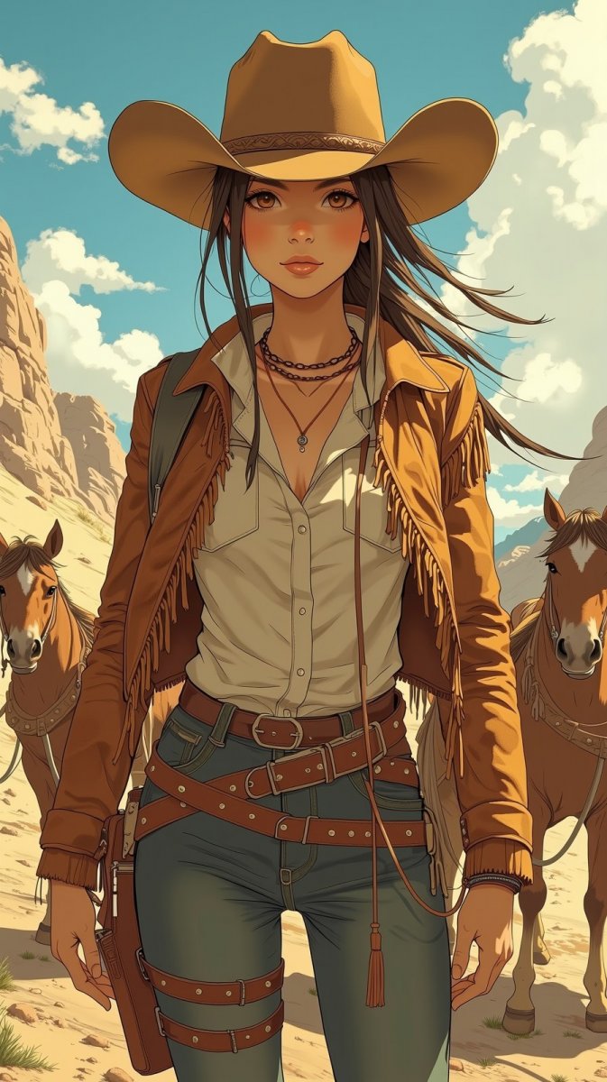#4. professional photo, photorealistic representation of a wild west cowgirl wearing a fringed leather jacket and cowboy hat, standing in a rugged landscape with horses in the background, her strong posture and confident gaze reflecting the spirit of frontier life #role_sorayama #sp_greek