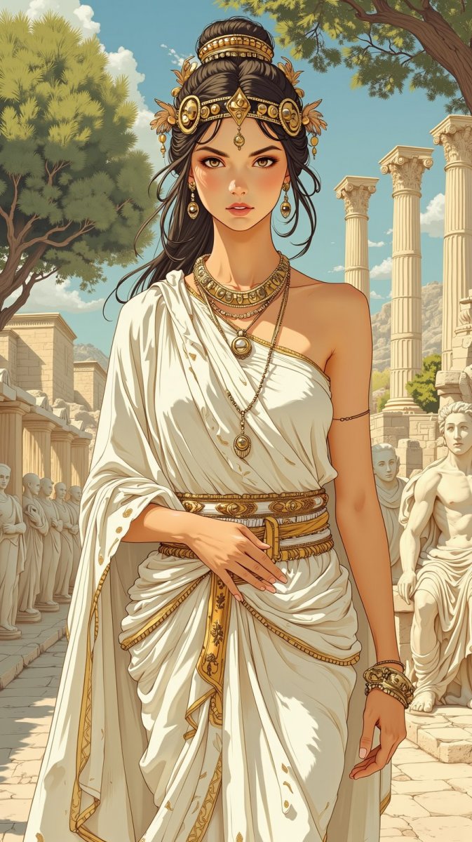 Изысканный портрет юной грекини, словно сошедший с античной статуи, пленяет своей реалистичностью и изяществом. Девушка облачена в струящиеся традиционные одежды, украшенные сложным орнаментом драгоценностей, что подчеркивает ее благородство и связь с богатой культурой Древней Греции. За ней простирается величественный пейзаж: древние колонны, утопающие в тени оливковых деревьев, создают атмосферу таинственности и гармонии. Мягкий свет, ласково окутывающий образ, акцентирует внимание на мельчайших деталях – от тонких черт лица до текстуры ткани, придавая портрету поразительную живость и достоверность. Эта работа представляет собой ода классической красоте, воплощенную в современном цифровом искусстве с использованием передовых технологий и мастерства фотореалистичной графики. Впечатление легкости и воздушности создается за счет идеально подобранного освещения, которое мягко подчеркивает плавные линии фигуры и создает ощущение движения. Фотография передает дух эпохи, сочетая в себе элементы античного искусства и современные техники визуализации, предлагая зрителю погрузиться в мир древнегреческой мифологии и эстетики. Это не просто изображение, это – поэтическое переосмысление вечных ценностей красоты, гармонии и величия