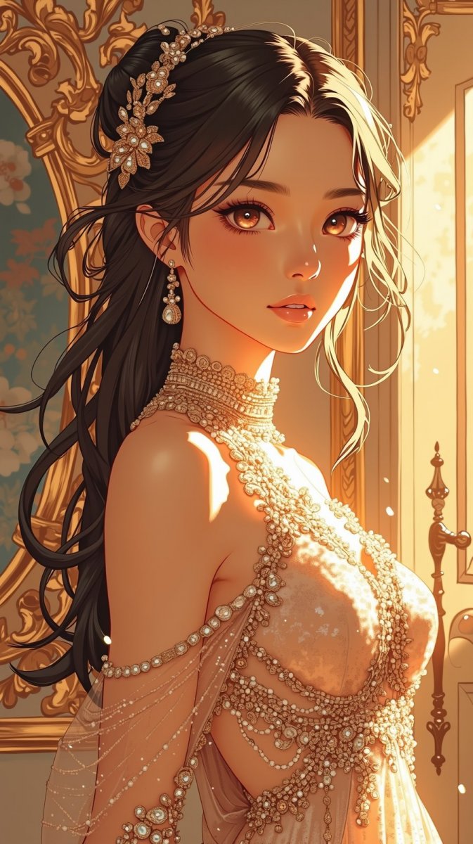 #1. professional photo, photorealistic image of a glamorous girl wearing a sparkling evening gown with intricate beading and bold accessories, posing elegantly against a luxurious backdrop, illuminated by soft lighting to enhance the details of her attire and accessories. #role_sorayama #sp_moda