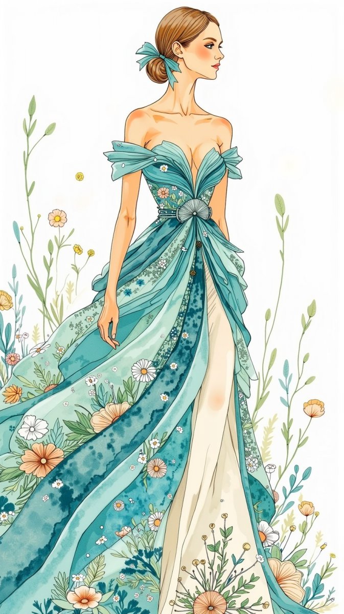 #2. Illustration, ink drawing, fashion girl, a fusion of Alexander McQueen's dramatic silhouettes and Stella McCartney's sustainable styles, featuring a whimsical gown with intricate floral patterns and structured lines, rendered in flowing watercolors with a sketch technique to highlight ethereal movement. #role_fashion_aqua