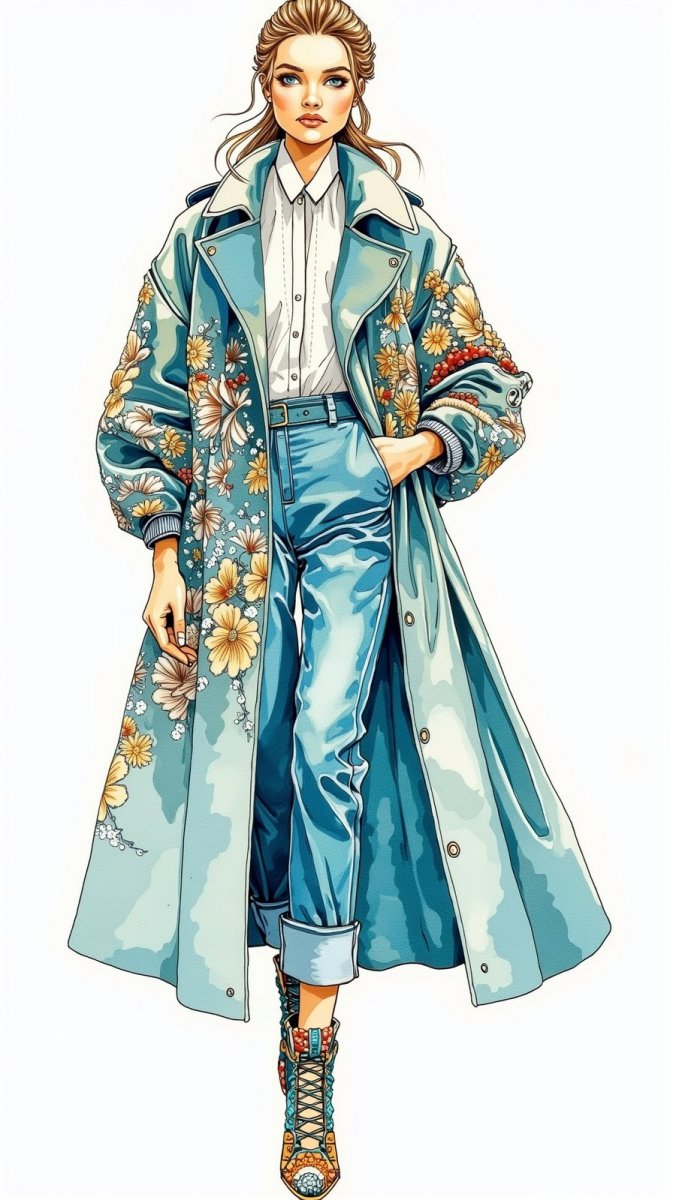 #4. Illustration, ink drawing, fashion girl, a striking duet of Balenciaga's oversized tailoring and Elie Saab's detailed embellishments, featuring a voluminous coat paired with intricately embroidered silhouettes, illustrated in delicate watercolors with grisaille technique to emphasize shadows and depth. #role_fashion_aqua