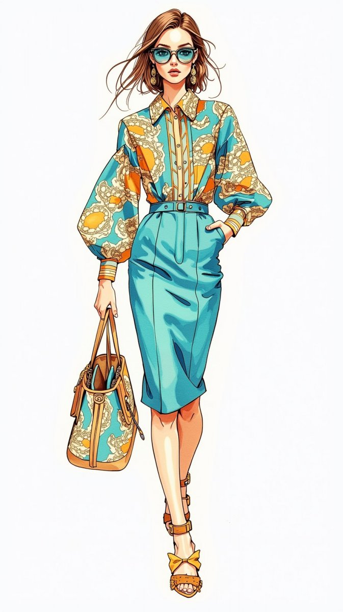 #3. Illustration, ink drawing, fashion girl, a unique blend of the playful graphics of Moschino and the sophisticated tailoring of Alexander McQueen, presenting an eclectic mix of bold prints and sharp cuts, depicted in a delicate watercolor technique, emphasizing luminosity and fine lines. #role_fashion_aqua
