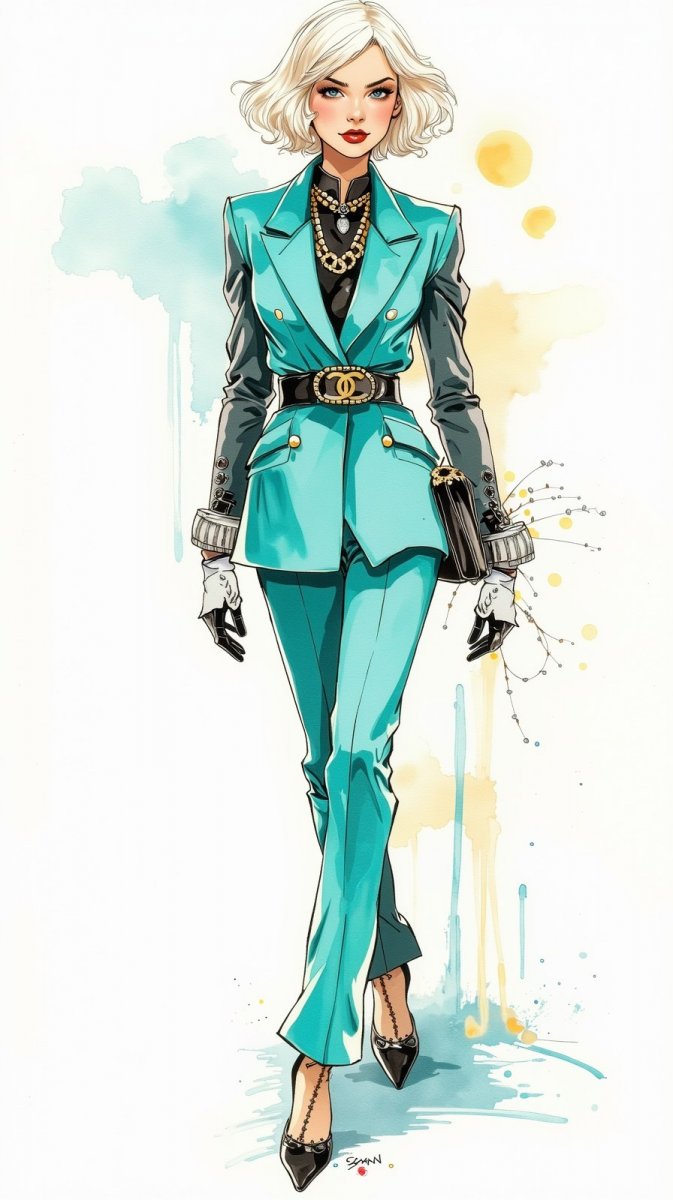 #5. Illustration, ink drawing, fashion girl, intertwining the classic elegance of Chanel with the bold punk inspirations of Alexander McQueen, capturing a platinum blonde model with an elegant short hairstyle, striking red lips, and long legs dressed in a sharply tailored suit featuring luxurious fabrics and edgy details, illustrated in a fresh, vibrant watercolor style that celebrates both sophistication and rebellion. #role_fashion_aqua
