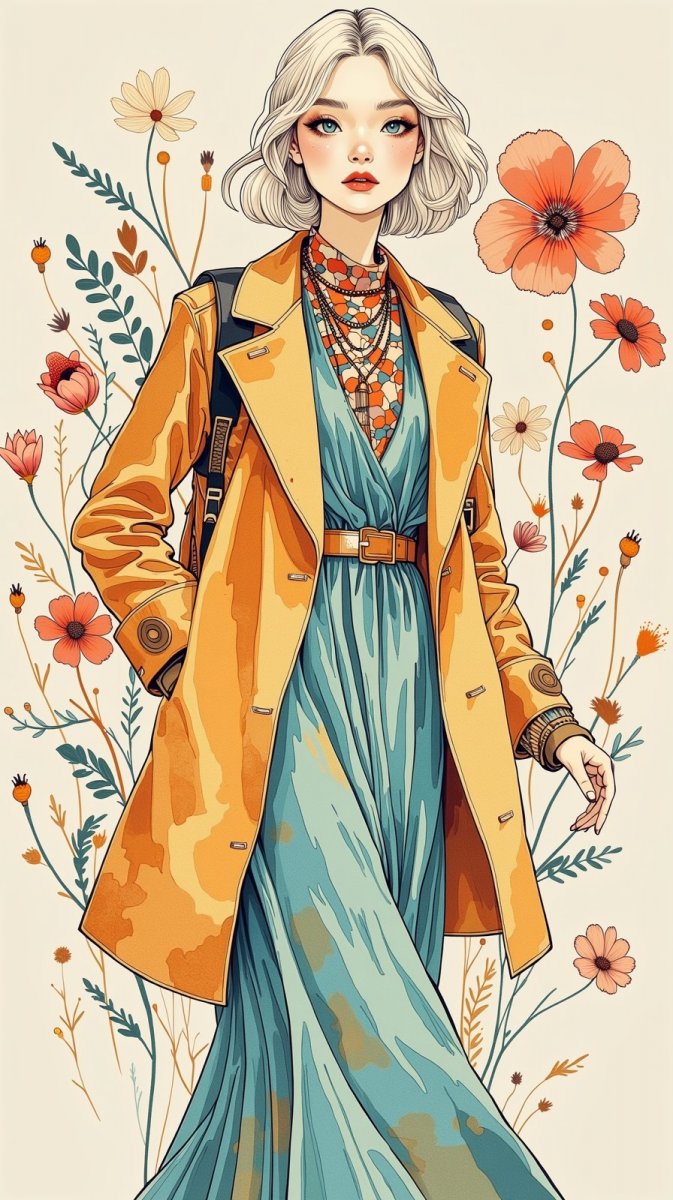 #2. Illustration, ink drawing, fashion girl, inspired by the vibrant colors of Etro combined with the minimalist approach of Helmut Lang, create a scene with a chic model featuring a short wavy platinum bob and striking crimson lips. Dressed in a flowing bohemian-inspired maxi dress layered over a structured, high-collared jacket, she poses gracefully against a backdrop of watercolor floral motifs, blending earthy tones with splashes of color that radiate warmth and individuality. #role_fashion_aqua
