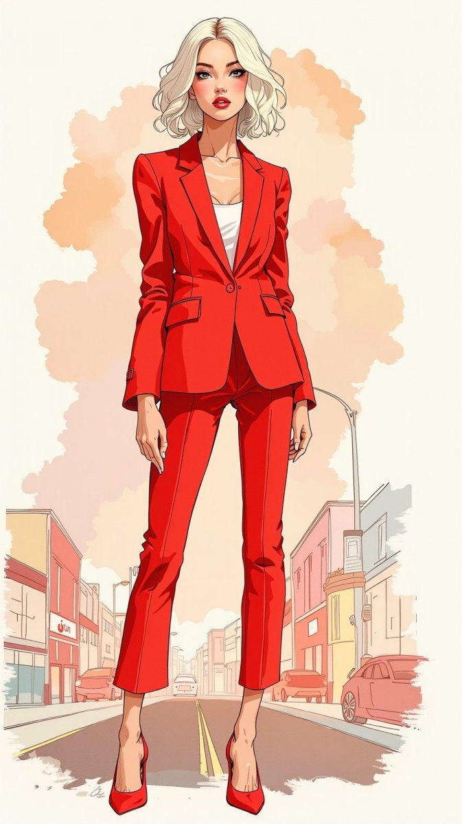 Элегантная модель с платиновыми волосами короткой пышной стрижки воплощает безупречный стиль в смелом алом костюме. Уверенная поза и длинные ноги подчеркивают ее грацию, а яркие красные туфли на высоком каблуке добавляют образу дерзости. На губах – насыщенный рубиновый оттенок, который привлекает внимание к выразительному лицу. Руки непринужденно покоятся по бокам, создавая ощущение естественной уверенности и спокойствия. Тонкий градиент в пастельных тонах на фоне усиливает эффект изысканности и создает атмосферу современной городской элегантности. Эта фотография – квинтэссенция современного модного искусства, сочетающая в себе утонченность, смелость и безупречный вкус. Она передает ощущение спокойствия и уверенности, демонстрируя силу стиля и женственности. Мягкое освещение и нежная цветовая палитра подчеркивают красоту модели и создают атмосферу мечтательности и роскоши. Идеальный образ для тех, кто ценит изысканность, современность и безупречный вкус. Это фото – воплощение модной эстетики, сочетающей в себе классическую элегантность и современные тенденции