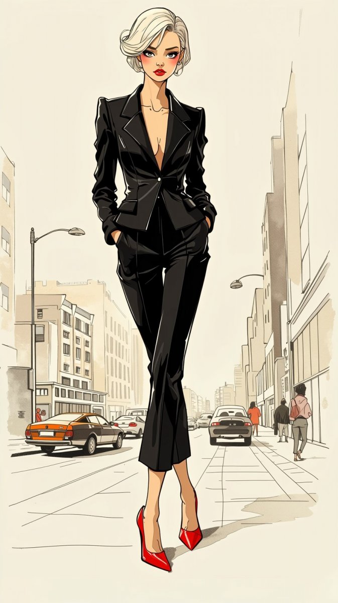 ink drawing, illustration, naive art, doodling, zentagle, folk art, cartoonish, paper cut gouache illustration, minimalism A stunning fashion model with a platinum blonde, voluminous short hairstyle and striking red lips embodies sophistication and power in a sharply tailored black suit inspired by Alexander McQueen's avant-garde structure, complemented by high-heeled red pumps reminiscent of Christian Louboutin's iconic style. Her long legs accentuate the sleek, minimalist silhouette, while an assertive gaze and a poised posture convey an air of confidence and ambition, set against a chic urban backdrop that enhances her commanding presence.